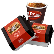 - A burger meal for two bought at a chain fast food restaurant popular in many cities. The taste and size of the burgers is perfect. It's just that the set only includes 1 cup of Dr. Cinnamon, which may lead to the ice melting into the drink as the two diners each try to let the other enjoy it.