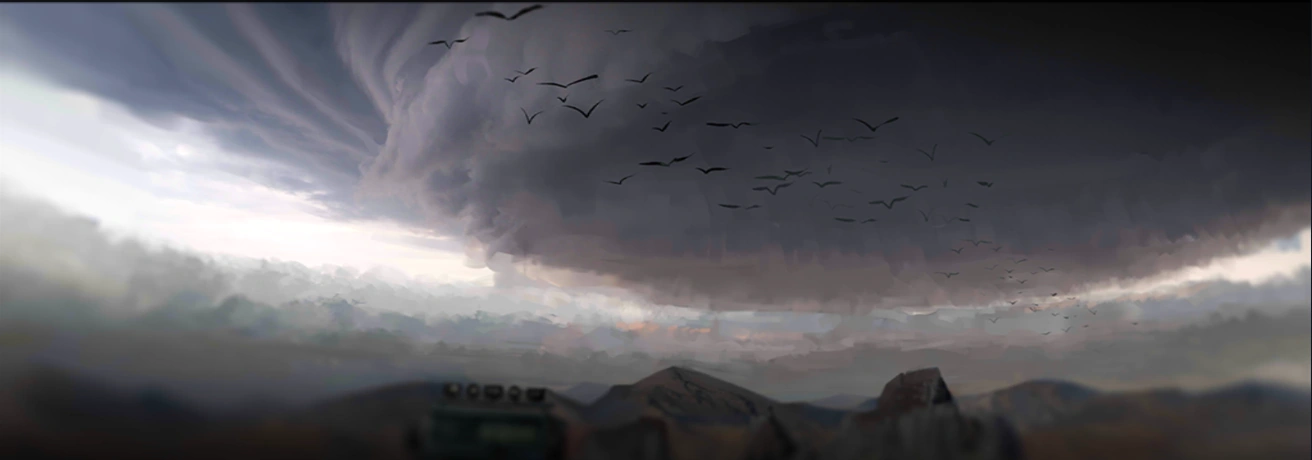 The tell-tale signs of an incoming Catastrophe: dark skies, turbulent weather, and a grim atmosphere.