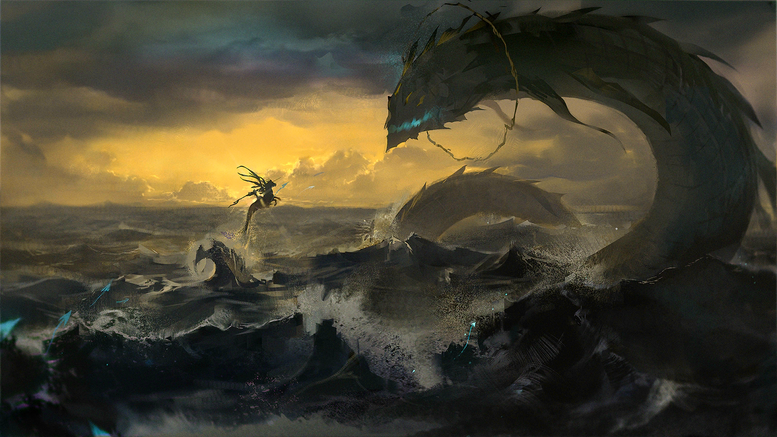 | The knight's soliloquy comes to an abrupt end. The sound of the surging waves, the whistling of fowlbeasts, the howling of the strident wind. In that instant, everything disappears. In complete silence, the wind rises and the clouds surge. After the moment of silence, the waves ascend, and calamity descends once again. Ishar'mla leads we many from the depths of the tides. No longer is Iberia the sole victim. Every corner of the land–– Shall be drowned out by the Profound Silence. The knight has lost his voice. He suddenly jerks the reins of his mount and aims the tip of his lance across the other side of the ocean. He lets out a great roar that makes his skull tremble, but when the sound reaches his ears, it is nothing more than a strange, shrill hiss. His arms are shaking, his breaths become rapid, and Rocinante keeps shaking its head. The Seaborn instinct continually pushes back against this internecine savagery, But the knight pays no heed to the cruel truth behind these physiological reactions. He is resolute in his belief that they arise from an uncontrollable ecstasy within his heart. After all–– | |