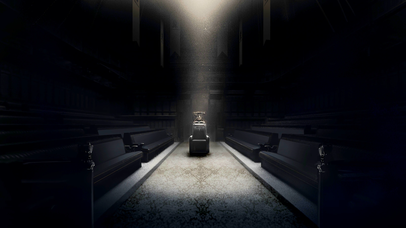 | Light floods into the building through the ceiling in the center, illuminating the entire atrium with an unnaturally bright glow. | |