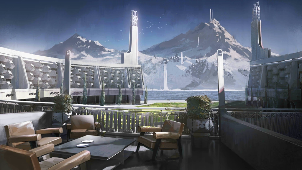 | Platinum finds herself in an Ursus villa, flanked by a mountain and lakes. There is also a tall tower far off in the distance. It soars straight through the clouds up above. | |