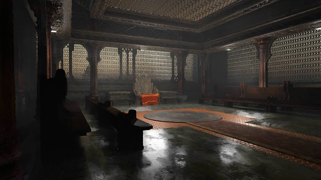 | [Enya Silverash the Karlan Saintess walks into the Karlan sanctuary's great hall as the elders of the Vine-Bear Court have gathered.] | |